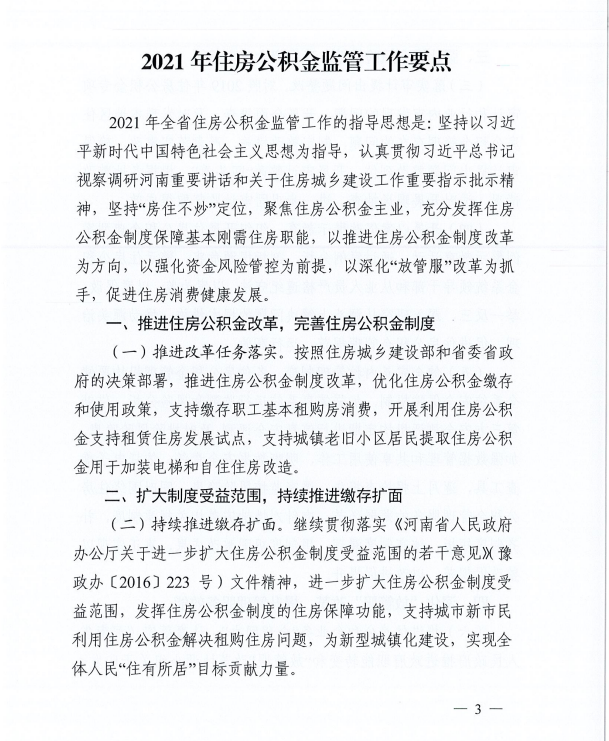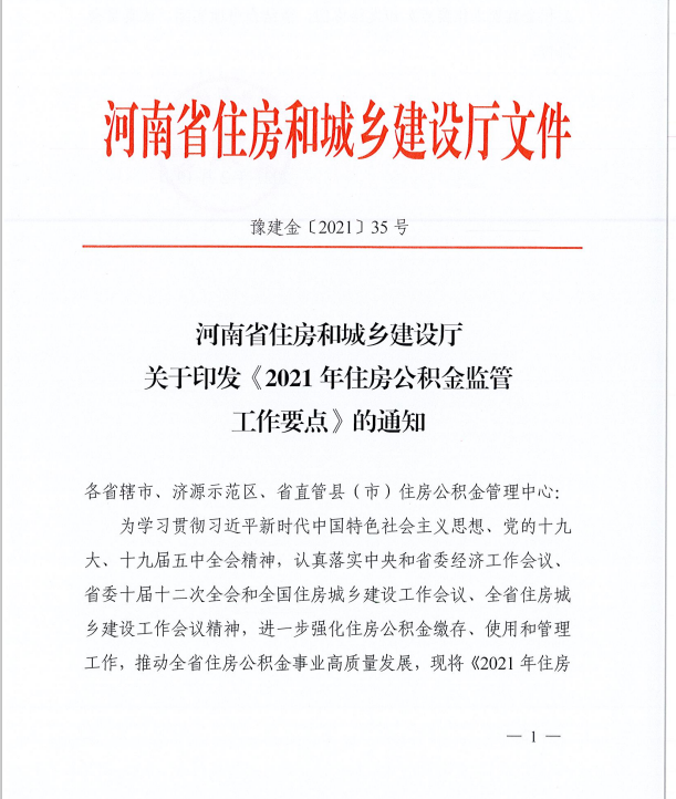 河南省住房和城乡建设厅关于印发《2021年住房公积金监管工作要点》的通知